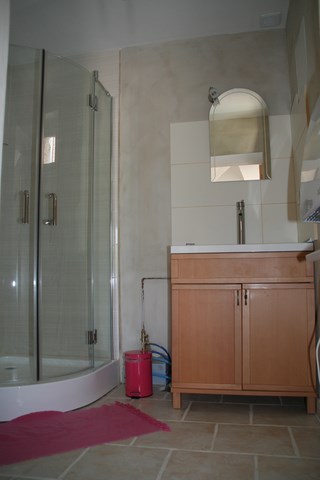 Une salle d'eau avec douche, lavabo, seche-serviette et WC