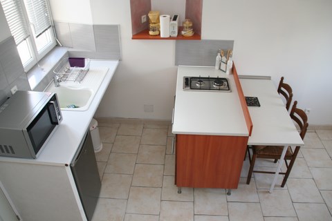 un coin cuisine : évier - plaque de cuisson - refrigerateur - four à micro-ondes ...